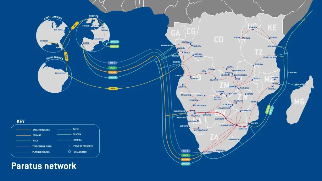 Strategic routes include connections from Johannesburg to Lubumbashi in southern DRC, crossing through Zambia, Zimbabwe and Botswana. In Botswana, Paratus has deployed a diverse fiber network via multiple towns to strengthen national reach and cross border stability.