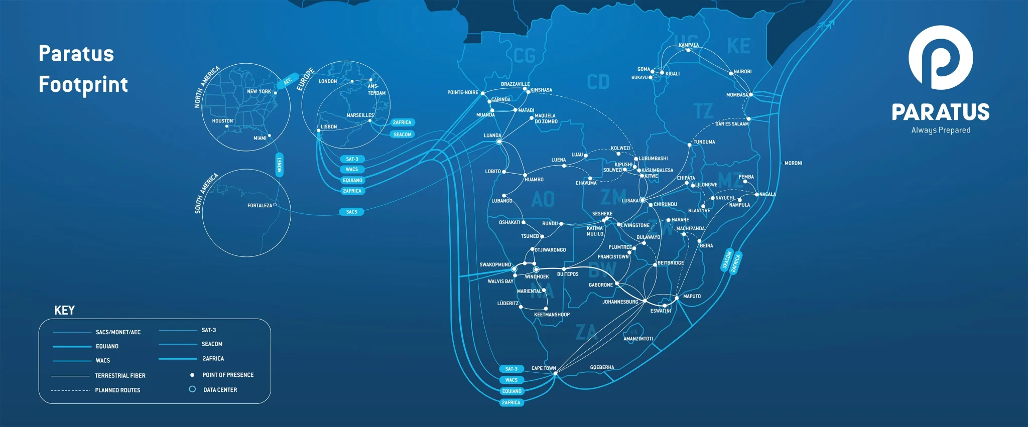 Com pontos de presença internacionais nos EUA, Reino Unido e Europa, estamos a avançar com a nossa visão Paratus 500 para conectar 500 milhões de pessoas em 16 países e capacitar África com conectividade contínua e ininterrupta.