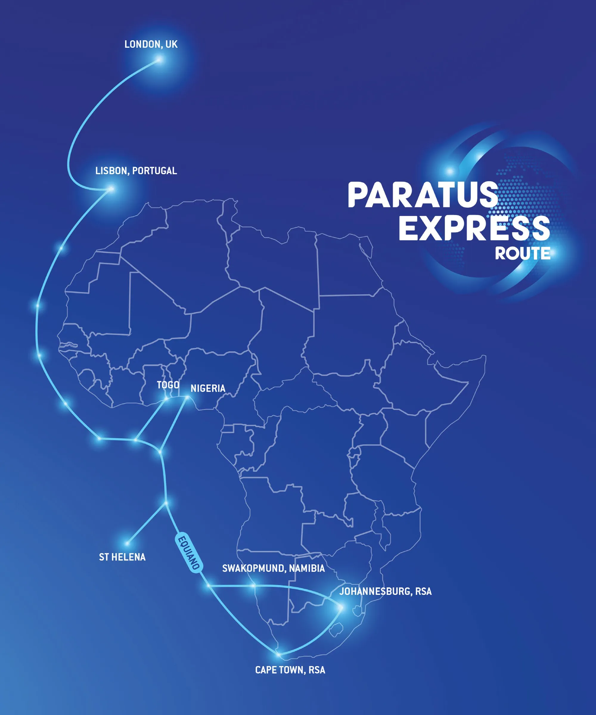 Paratus has developed a robust terrestrial fiber route across southern Africa, with cross-border links from Namibia to Zambia and Botswana, and from Botswana to Johannesburg. This configuration bypasses central and western South Africa, providing resilience and redundancy.